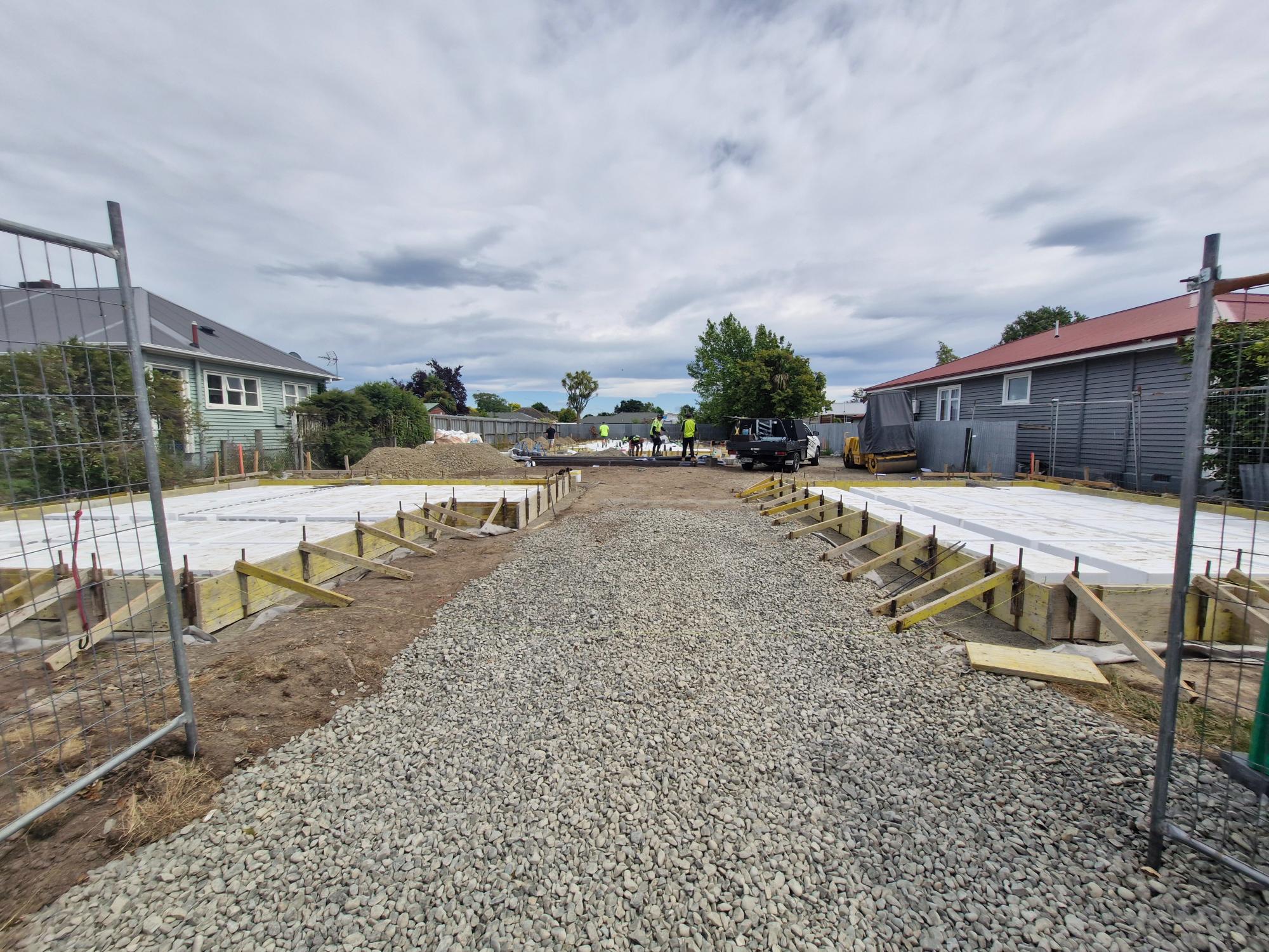 - At this point, the concrete floor slabs are completed, and we will proceed to start framing each house.